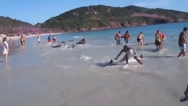 Дельфины выбрасываются на берег
