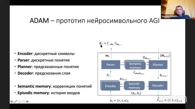 Иерархический дизайн сильного искусственного интеллекта (ADAM) — Сергей Шумский Семинар русскоязычного сообщества AGI 29 сентября 2022 https://agirussia.org/ Мы ведем группы и организуем семинары русскоязычного сообщества разработчиков систем AGI (Artificial General Intelligence или Общий Искусственный Интеллект) или Strong AI (Сильный Искусственный Интеллект), а также - являющийся их частным случаем HLAI (Human-Level Artificial Intelligence или Искусственный Интеллект Человеческого Уровня). Группы: https://t.me/agirussianews (новостной канал) https://t.me/agirussia (основная) https://t.me/agiterms (вопросы терминологии) https://t.me/agibots (разговорный интеллект) https://t.me/agifintech (финансовые технологии) https://t.me/collectivei (коллективный интеллект) https://vk.com/agirussia https://www.facebook.com/groups/agirussia (основная) https://www.facebook.com/groups/socialintelligence (коллективный интеллект) https://groups.google.com/g/agirussia Онлайн-семинары идут по четвергам, в 18:00 по Московскому времени. Продолжительность два часа, обычно это либо доклад на один-полтора часа и последующее обсуждение на полчаса-час либо круглый стол с регламентом на усмотрение модератора дискуссии. Технические средства проведения, регламент и модерацию обычно обеспечивает инициатор конкретного семинара либо спикер и его коллеги. Регистрация на семинары (внизу страницы): https://aigents.timepad.ru/event/1412596 Программа следующих семинаров: https://agirussia.org/workshops.html