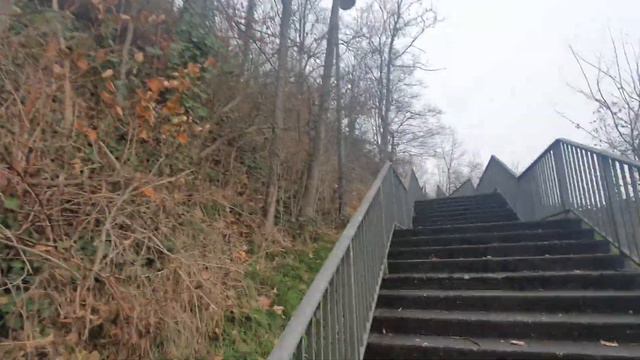 Eine lange Treppe, die von der Kreuzung den Berg hinauf führt. Oben angekommen, ist man froh, dass man den Aufstieg hinter sich hat.