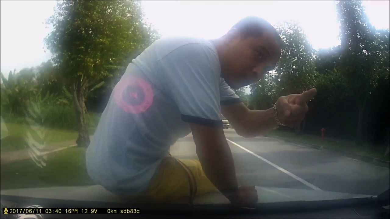В Сингапуре водитель со свими детьми двигался по дороге, когда неадекватный пешеход запрыгнул к нему на капот, видимо пытаясь инсценировать аварию. #капот #автомобиль #неадекват