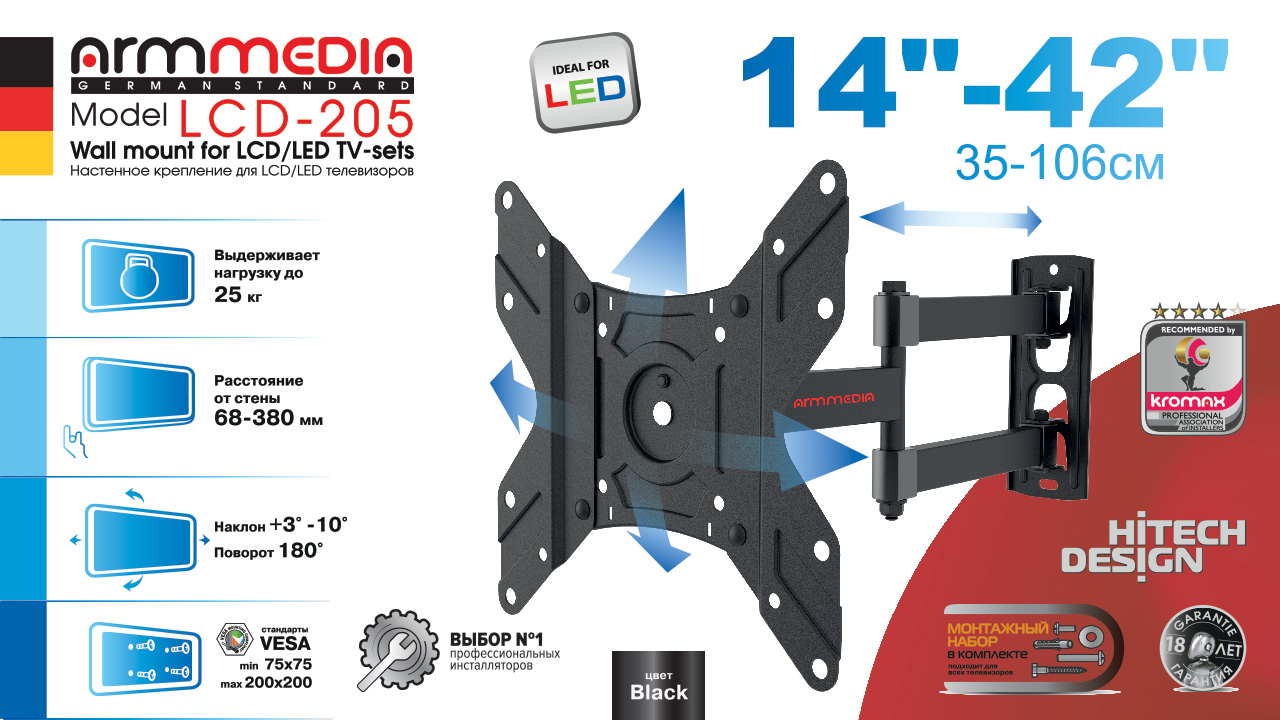 ARM MEDIA LCD-205 BLACK BLACK надёжно удержит экран размером 14"-42" дюйма и весом 25 кг. Простая конструкция ARM MEDIA LCD-205 BLACK BLACK идеально подойдет для самостоятельного монтажа. Наклонно-поворотная регулировка позволит наклонять вверх и вниз на +3 -10°, поворачивать влево и вправо на 180°, и выдвигать на 68-380 мм. Кронштейн подходит для большинства телевизоров популярных брендов, таких как Samsung, LG, Sony, Panasonic, Sharp, Toshiba, KIVI, Xiaomi Mi, SUPRA, Hyundai, Erisson, Horizont, JVC, Thomson, HAIER, BBK, Витязь, Веко, BQ, OZON, SkyLine, Pioneer, Philips, Rolsen, Harper, Hisense, Hitachi, Polarline, Prestigio и других. Крепёжные отверстия ARM MEDIA LCD-205 BLACK изготовлены по стандарту VESA. В комплектацию ARM MEDIA LCD-205 BLACK входят необходимые для монтажа материалы. Вся продукция обеспечивается гарантийными обязательствами. 18 лет гарантии на все сварные и механические соединения позволит наслаждаться конструкцией долгий срок. Во время эксплуатации ARM MEDIA LCD-205 BLACK демонстрирует поразительную износостойкость и безотказность. Подробнее https://www.kromax.ru/produce/pan_tilt/13207/