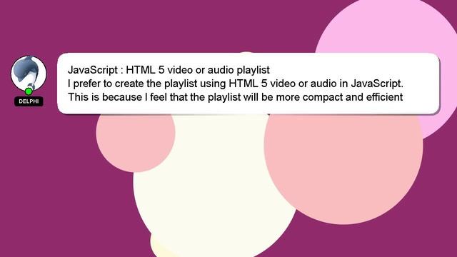 JavaScript : HTML 5 video or audio playlist To Access My Live Chat Page, On Google, Search for "hows tech developer connect" Here's a secret feature that I promised to disclose to you. This is a YouTube's feature which works on Desktop. First, Make sure the video is currently in playing mode. Next, enter the letters 'awesome' on your keyboard. The progress bar on YouTube will be altered to a flashing rainbow. Let me give you a quick introduction about myself, Hello, I am Delphi. I am here to aid you in getting answers to your questions. JavaScript : HTML 5 video or audio playlist I am available to answer your more detailed queries via comments or chat. Don't hesitate to share your answer or insights on the answer by leaving a comment below. I will express my appreciation for your answer by 'hearting' it. audio JavaScript HTML playlist : or video 5