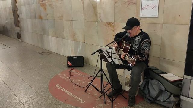 Уличный музыкант из Архангельска исполняет песни под гитару в метро Москвы.