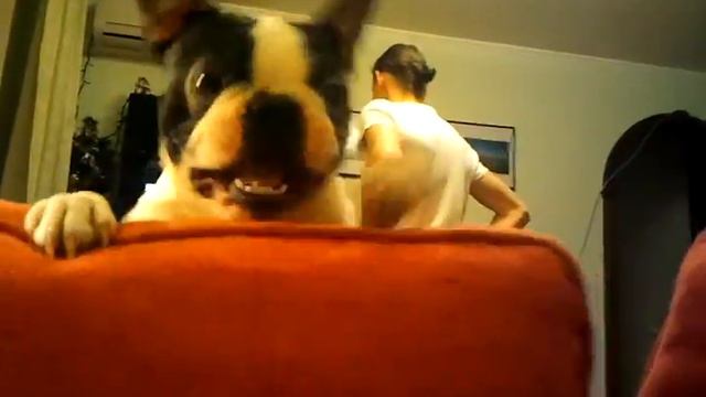 Бостон терьер охотится за рукой