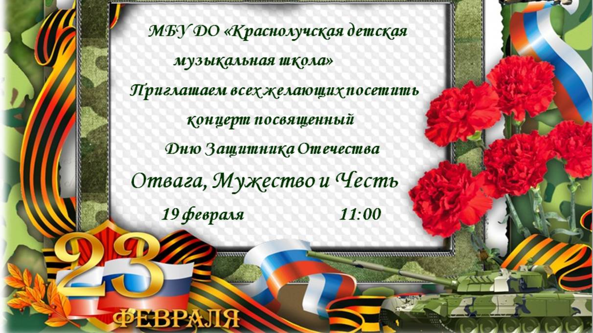 01:20 Вокально-эстрадный ансамбль - музыка Н. Наскалова, слова Н. Павленко «Плечо к плечу», руководитель Филатова Ольга Александровна 05:18 Порохня Артем «Высота» - слова и музыка Сергея Нихаенко, преподаватель Глемба Алина Сергеевна. 08:21 Черкас Алина - М. Блантер «Катюша», преподаватель Бесараб Ирина Дмитриевна 10:28 Лящевская Полина - «Моя Россия» слова и музыка Ярослава Дронова, преподаватель Глемба Алина Сергеевна 13:39 Кирилова Амира « Матушка-Земля» музыка и слова Петра Андреева преподаватель Филатова Ольга Александровна 17:06 Лящевская София - «Дети войны», преподаватель Глемба Алина Сергеевна 21:33 Ансамбль «Нескучные ребята» - А. Пахмутова «Трус не играет в хокей» руководитель Гнедова Антонина Михайловна, концертмейстер Еремеева Светлана Петровна 24:25 Гаврилов Виктор - Ральф Ловланд «Нежность», преподаватель Остапенко Мария Александровна, концертмейстер Высоцкая Алина Геральдовна. 28:50 Вокальный Ансамбль «Штрих» музыка Е. Гончарук, слова Н Ковтун «Письмо солдату», руководитель Храмова Наталья Владимировна, концертмейстер Галина Филюнина. 32:11 Орловский Владислав - р.н.п. «Коробейники» обработка А. Сушкина, преподаватель Филатова Ольга Александровна 35:45 Фортепианный дуэт Бесараб Ирина Дмитриевна, Гаврилова Марьяна - В. Соловьев –Седой «Вечер на Рейде» 38:10 Мироненко Дмитрий - «Служить России» муз. Эдуарда Ханок, слова Ильи Резник, преподаватель Филатова Ольга Александровна 42:18 Ансамбль преподавателей «Кантабиле» Альфред Шнитке «Адажио» из балета «Эскизы»