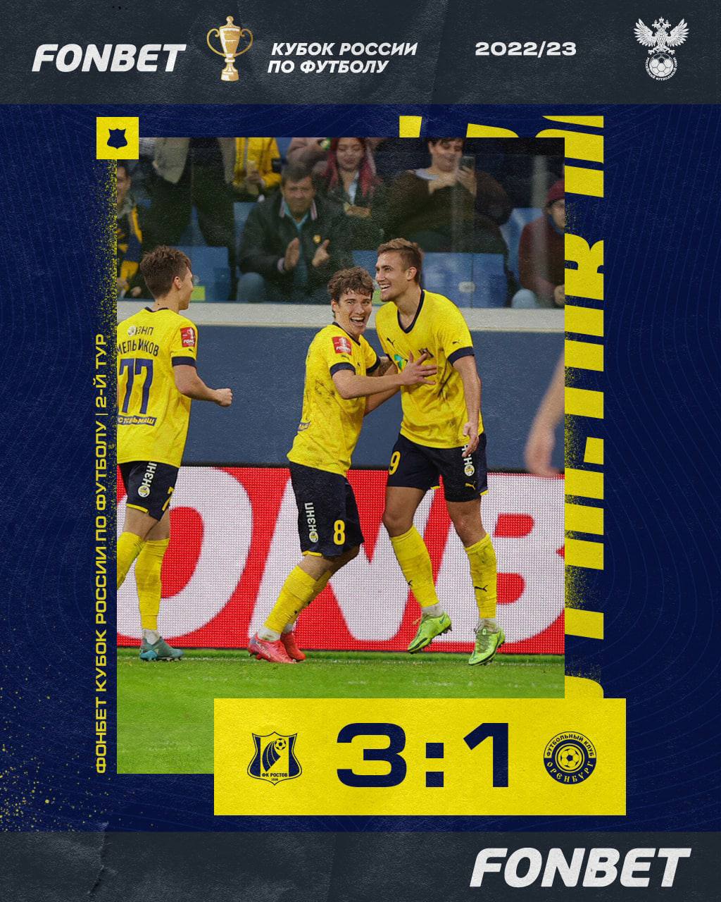 ?? «Ростов» победил «Оренбург» в ФОНБЕТ Кубке России Встреча завершилась со счетом 3:1. У команды Карпина дубль на счету Голенкова, еще один мяч добавил Щетинин. У гостей отличился Сиваков. У ростовчан 2 победы в 2 матчах Кубка. У команды Лички 0 очков в группе.