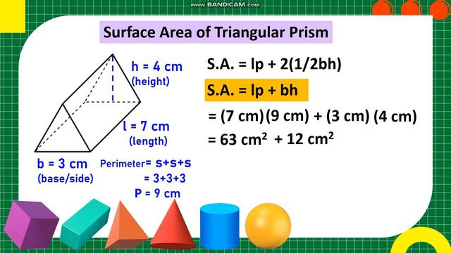 This is a video lesson on finding the surface area of solid figures. Surface Area is the sum of areas of all lateral faces and bases of a solid figure. #SurfaceArea #AreaOfSolidFigures #MitchRen TV Music used, thanks to: www.bensound.com Screen record used, thanks to: www.bandi.com References: DepEd 21st Century Mathletes 6 Rex Book Store Math For Life 6 Everyday Math 6 Module Third Quarter Pictures credit to the owner Don't forget to SUBSCRIBE! https://www.youtube.com/channel/UCguaRZlfR950lAhdaX6V9vQ
