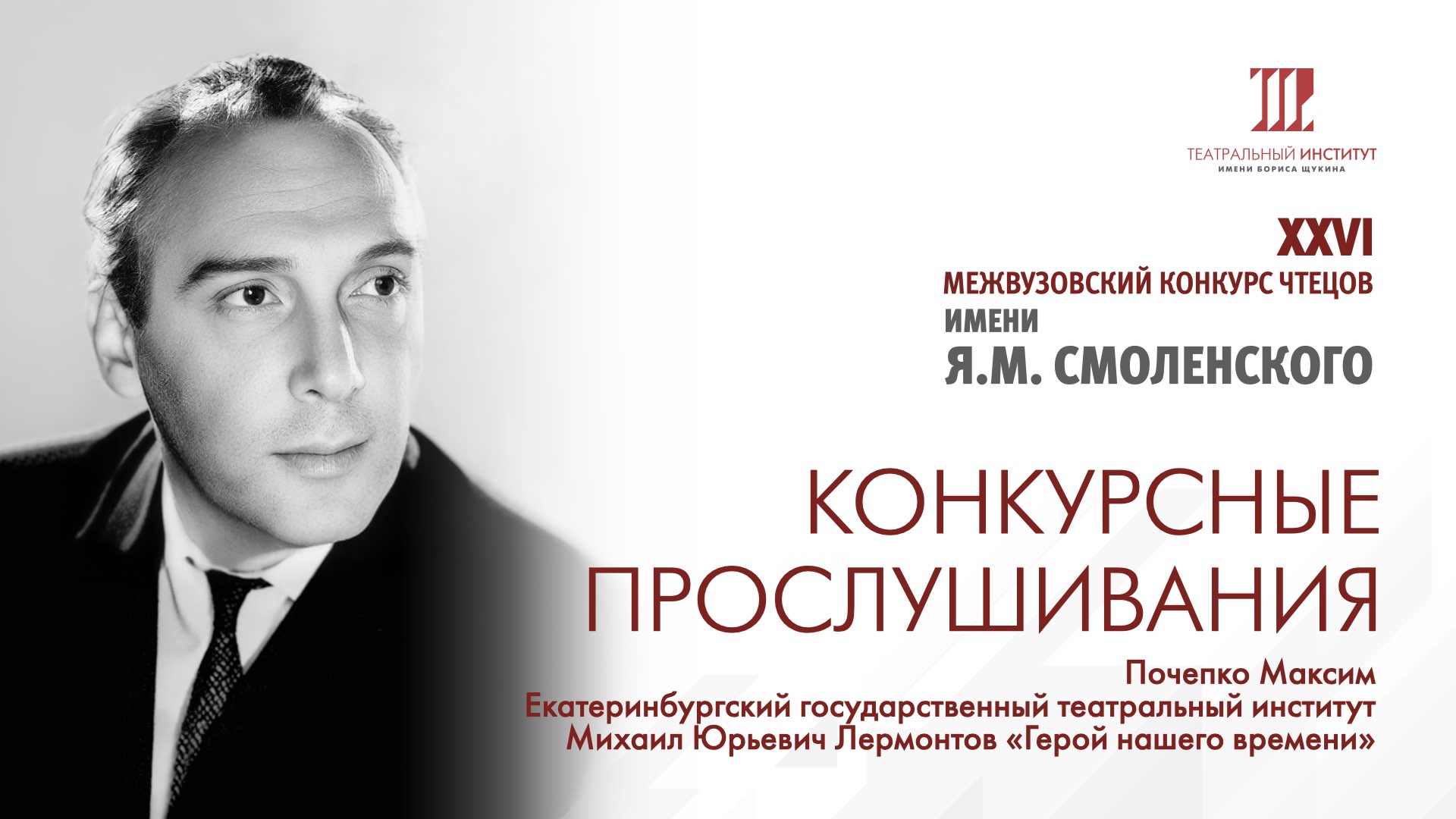Запись конкурсных выступлений XXVI межвузовского конкурса чтецов имени Я.М. СМОЛЕНСКОГО. 1-й конкурсный день. Почепко Максим. Екатеринбургский государственный театральный институт. Михаил Юрьевич Лермонтов «Герой нашего времени». Театральный институт им. Бориса Щукина при Государственном академическом театре им. Евгения Вахтангова. 119002, Россия, г. Москва, Большой Николопесковский пер., д. 12а, стр.1. Архив Учебного театра. © Театральный институт имени Бориса Щукина. 2024 г.
