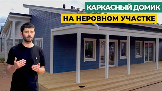 Одноэтажный дом с большой террасой на участке с перепадом