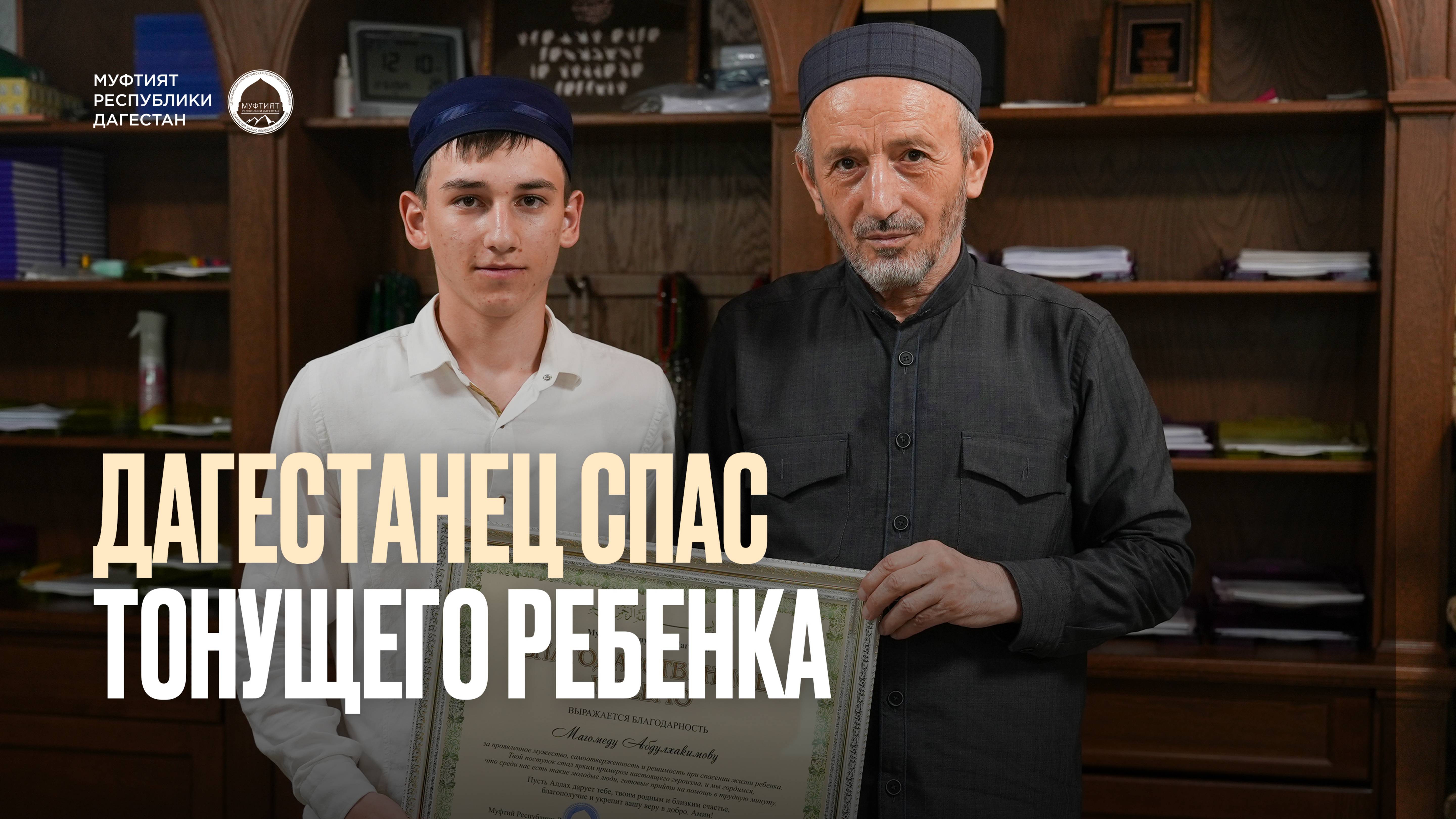 Муфтий Дагестана, председатель Совета алимов РД, шейх Ахмад Афанди встретился с девятиклассником, спасшим ребёнка – Магомедом Абдулхакимовым. Шейх поблагодарил школьника за смелый поступок и выразил добрые пожелания подростку и его родителям, которые пришли вместе со своим ребёнком к духовному наставнику. Напомним, Магомед возвращался домой, когда услышал крики о помощи – в канале Октябрьской революции тонул мальчик. Магомед не раздумывая бросился в воду и спас тонущего.