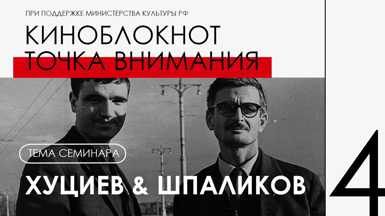 Цикл семинаров проекта «Киноблокнот Точка внимания» лектория Школы умного кино. Проект создан при поддержке Министерства культуры Российской федерации. Семинар №8. Персоны семинара – Марлен Хуциев и Геннадий Шпаликов. Режиссер и сценарист. Их единство и «разность» — предмет обсуждения на семинаре. Ведущий семинара: кинорежиссер Андрей Истратов — автор популярного док-драма сериала на ТВ-Культура «Легенды мирового кино», руководитель Школы умного кино Соведущая семинара: режиссер-документалист Анисия Шарафутдинова В четвертой части семинара: 00:00 Как это снято? Сравниваем одну и ту же сцену из к/ф «Застава Ильича» и «Мне 20 лет» 16:08 Рефлексия со зрителями - слушателями семинара - по поводу обсуждаемой сцены. 22:56 Соавторство режиссера и сценариста. Фрагменты из к/ф «Весна на Заречной улице». Разбирают Анисия Шарафутдинова и Андрей Истратов 37:22 Пара слов о документальном фильме Андрея Истратова «Киноязык эпохи: Марлен Хуциев» 37:34 Вместо финала. О съемках одного кадра в фильме «Бесконечность» Марлена Хуциева В данном видеоподкасте использованы фрагменты фильмов: - Застава Ильича / Мне двадцать лет (реж. М. Хуциев, Киностудия им. Горького, 1964) - Весна на Заречной улице (реж. М. Хуциев, Одесская киностудия, 1956)