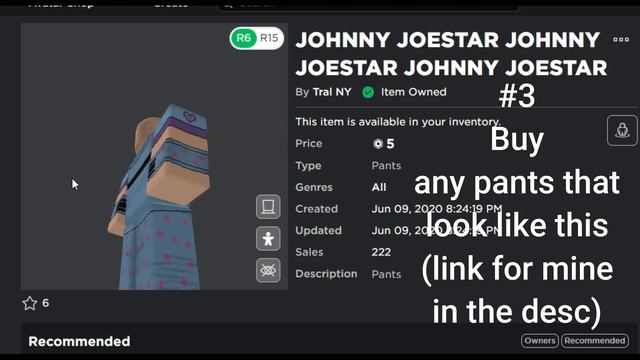 you asked for it Hair: https://web.roblox.com/catalog/137714508/Blonde-Athlete Shirt: https://web.roblox.com/catalog/5241884574/JOHNNY-JOESTAR-JOHNNY-JOESTAR-JOHNNY-JOESTAR Pants: https://web.roblox.com/catalog/5159232463/JOHNNY-JOESTAR-JOHNNY-JOESTAR-JOHNNY-JOESTAR Menacing: https://web.roblox.com/catalog/4238305136/Menacing Golden Teeth: https://web.roblox.com/catalog/4793975108/Golden-Grill GET ME TO 300 SUBS!!! or 500, whatever works for you https://www.youtube.com/channel/UCTlat4Ltc7AuBwIEhkaNP4w?view_as=subscriber