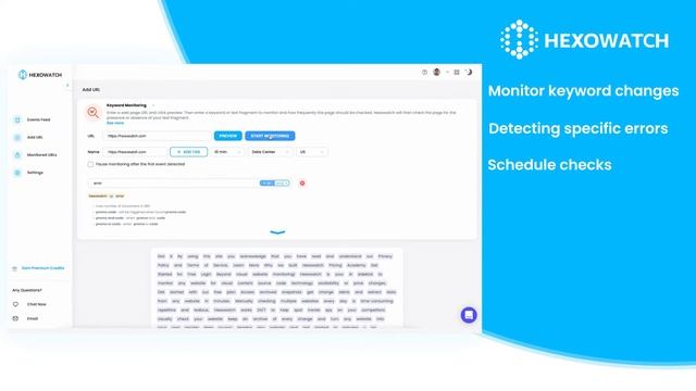 The Hexowatch keyword monitor is great for keeping an eye out for specific keywords on a page. This is ideal for picking up mentions of your brand, checking for special offers, or picking up on specific errors on a page. Follow our tutorial to start monitoring in minutes. Get started free at https://hexowatch.com