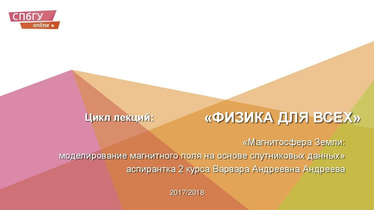 Магнитосфера Земли: моделирование магнитного поля на основе спутниковых данных Солнечно-земное взаимодействие – одна из важнейших проблем, изучаемых наукой геофизика. В результате этого взаимодействия образуется магнитосфера – магнито-плазменная оболочка нашей планеты. Во время лекции вам расскажут о процессах формирования магнитосферы, внешнем и внутреннем магнитосферных магнитных полях и методах восстановления магнитной конфигурации на основе спутниковых наблюдений. Вы познакомитесь с понятием «космическая погода» и узнаете подробности о связанных с ней явлениях – магнитные бури и полярные сияния. Читает Варвара Андреевна Андреева. --- Лекторий "Физика для всех" 2017-2018 гг. --- Лабораторная экспериментальная площадка для школьников Ресурсного образовательного центра по направлению "Физика" Научного парка СПбГУ Сайт: phl.spbu.ru Группа ВК: vk.com/phl.spbu
