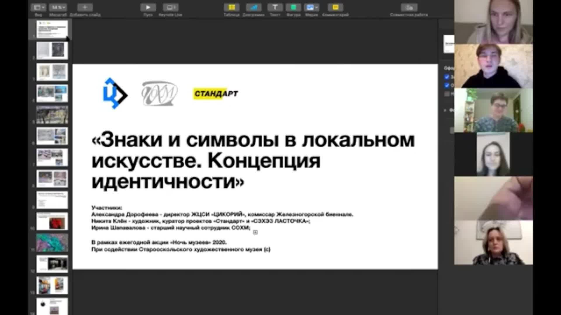 «Знаки и символы в локальном искусстве. Концепция идентичности» – это разговор в онлайн-пространстве об универсальных метафорах города через оптику изобразительного искусства. Город – это набор визуальных маркеров, которые вызывают у его жителей определенный образ. Дискуссия – это попытка найти общий вектор через интерпретации и предложенные доводы. В результате дискуссии удалось выяснить, что Старый Оскол – это в большей степени про «перформативность», что обусловлено наличием театра в городе. Но единого символа у города нет, кроме краеведческого музея. Через искусствоведческие тезисы и анализ произведений художников удалось найти не символы и визуальные маркеры, а атмосферу Старого Оскола. В дискуссии приняли участие независимые местные кураторы и приглашенный спикер из Железногорска – Александра Дорофеева (комиссар Железногорской биеннале). Поиски локальной идентичности до сих пор находятся в стадии живой дискуссии.
