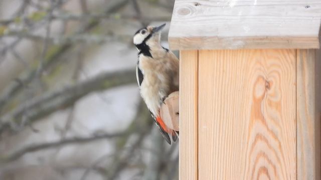 Дятел, самка, присматривается к скворечнику, наблюдение птиц в Великом Новгороде, 23 февраля 2024