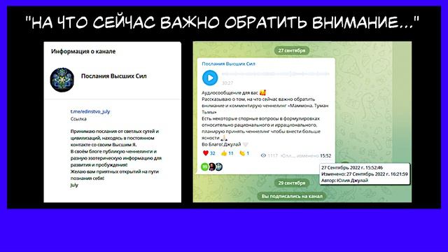 Ссылка на источник: https://t.me/edinstvo_july/277 Автор Джулай опубликовала в своём телеграм-канале весьма содержательное голосовое сообщение, которое скопировано и загружено в виде ролика здесь. Телеграм канал автора Джулай: "Послания Высших Сил" https://t.me/edinstvo_july Статьи автора на ресурсе Абсолютера: https://absolutera.ru/user6156/articles "Послания высших Сил" Звуковой файл "на что сейчас важно обратить внимание" в телеграм-канале сопровождён пояснением: Аудиосообщение для вас 🥰 Рассказываю о том, на что сейчас важно обратить внимание и комментирую ченнелинг «Маммона. Туман Тьмы» Есть некоторые спорные вопросы в формулировках относительно рационального и иррационального, планирую принять ченнелинг чтобы внести больше ясности 🙏🏻 Во Благо! Джулай 🤍