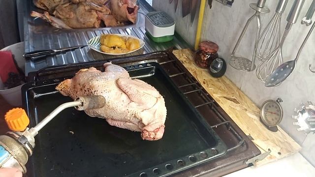 Опаливаю кур, готовлю мясо для переработки.