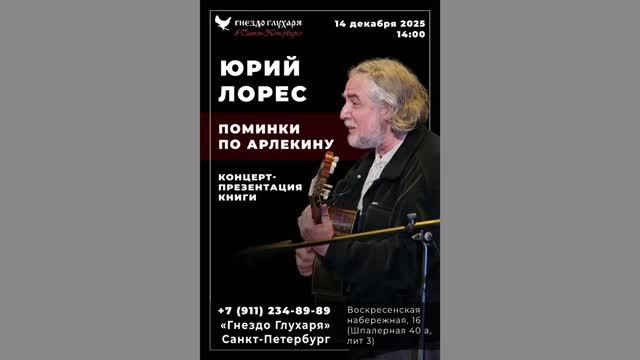 Юрий Лорес (г. Москва). Презентация книги «Поминки по Арлекину» при участии Владимира Решетова. Бард-клуб «Гнездо глухаря в Санкт-Петербурге». 14 декабря 2025 г. Видеозапись - Алла Левитан. Санкт-Петербург, Воскресенская наб., д. 16. 1 отделение: 0:00:00 вступление 0:01:28 ПРОГУЛКА ПО МОСКВЕ («Мы пойдем бродить с тобой…») 0:04:08 ГОРОД АКВАРЕЛЬНЫЙ («Приеду - и опять на сердце потеплеет…») 0:05:40 ВЕТЕР НАД РЕКОЙ («Непросто отыскать знакомое лицо…») 0:08:45 «Когда стремятся всё переиначить…» 0:11:33 О книге «Поминки по Арлекину» 0:15:15 Монолог второго актёра («По улицам кривым, по переулкам…») 0:17:43 Песня Арлекина («Сегодня я играю роль…») 0:19:03 Песня Арлекина («Вот сцена. Досок скрип…») 0:20:00 Песня Арлекина («Жизнь прожить - как пройти по проволоке…») 0:21:30 Монолог Арлекина («Уже который год подряд солдату не в кого стрелять…») 0:23:52 Монолог второго актёра («Толпа, идущая в метро…») 0:26:05 Хор паяцев («Кто последний? Что дают…») 0:28:17 Хор паяцев («На нашем знамени лозунг “Равенство”…») 0:29:51 Монолог второго актёра («Возможно, каждый честен наедине с собой…») 0:32:12 Монолог в комнате («Только часы надоедливо тенькают…») 2 отделение: 0:35:07 О пьесе «Поминки по Арлекину» 0:37:22 ВЛАДИМИР РЕШЕТОВ - о знакомстве с пьесой и о себе 0:40:01 БАЛЛАДА О ЩЕПКЕ («Что вам щепка? Источник заноз…») 0:41:19 SIC TRANSIT GLORIA MUNDI (ТАК ПРОХОДИТ МИРСКАЯ СЛАВА) («Мне надели лавровый венок…») 0:42:30 ОЧЕРЕДЬ НА НОЕВ КОВЧЕГ («Не может нравиться погода…») 0:43:34 Писать стихи не божий дар... 0:44:12 ЮРИЙ ЛОРЕС 0:45:03 В ПЕРЕСТРОЙКУ («Жалеть себя не надо и сетовать на жизнь…») (на мел. песни «Атланты» А. Городницкого) 0:47:23 «Мне очень хочется на север…» 0:49:53 МАСЛИЧНАЯ ГОРА («Что слышишь ты, масличная гора…») 0:52:01 ШУЛАМИФЬ («А живу я, огромную цену за жизнь заломив…») 0:54:49 ШИПОВНИК («Пять веков картине…») 0:57:49 АВГУСТ («Не так закат горит…») 01:00:35 ВРЕМЕНА («Поскольку беда не горе…») 01:02:06 «Опять сижу без денег…» 01:04:05 «Что мне в будущем вашем…» 01:05:57 «У твоего окна…» 01:09:20 МАРБУРГ («Михал Васильич Ломоносов так представлялся, например…») 01:12:47 РАЗМЫШЛЕНИЯ НА 9 МАЯ («Остаюсь вашим сыном и внуком…») 01:14:47 «Остановите этот мир!..») 01:17:45 «Я бегу от безбожных идей...» 01:22:03 ПАМЯТИ ДРУЗЕЙ («Время мчится так что не угнаться…») 01:25:04 ЧТО ДУШИ ДЕЛАЮТ В РАЮ («Вот я, задумавшись, стою…») 01:28:57 ЭПИКУРЕЙСКАЯ («Чтоб позабыть печаль и дать душе согреться…») Полная аудиоверсия поэмы: https://my.mail.ru/music/songs/yuriy-lores-pominki-po-arlekinu-muzofon-com-605f2d743a7146e2375630a0496ae204