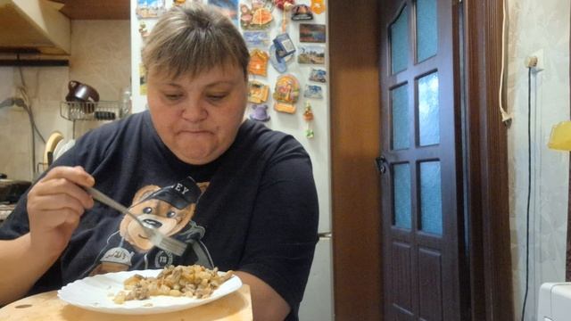 мукбанг ем жареную картошку с грибами