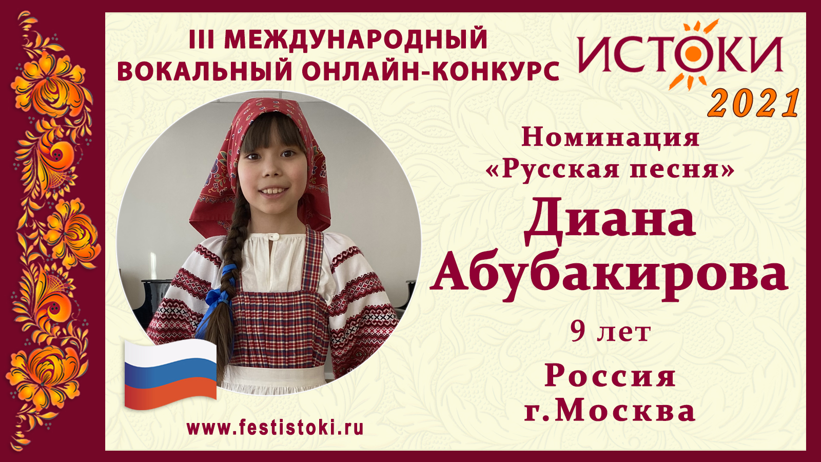 Лауреат III степени III Международного вокального онлайн-конкурса «Истоки». Номинация "Русская песня". Лирическая Смоленской области "Ты крапивушка". Сайт: www.festistoki.ru / www.festistoki.com E-mail: festistoki@mail.ru