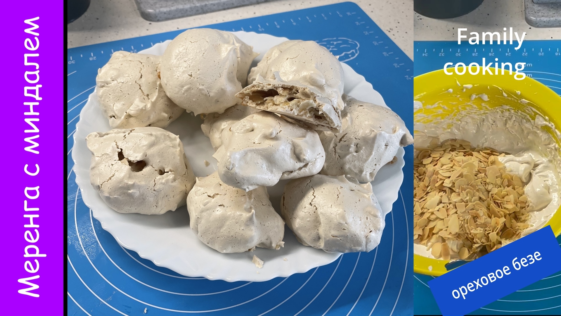 Смотрите все рецепты автора на сайте https://profamilycooking.ru Больше рецептов, удобный поиск и возможность сравнения рецептов на сайте https://piroved.ru Нежное, воздушное печенье безе/меренга с миндалем. Моментально улетело с тарелки. Удивите семью и друзей! 00:00 Меренга с миндалем 00:10 Ингредиенты 00:30 Миндальные лепестки подсушить в духовке при 150 градусах 10-15 мин до золотистого цвета 00:37 Белки взбить в чистой сухой миске до белой пены. Жидкости на дне быть не должно. 01:10 Постепенно порциями ввести коричневый сахар и сахарную пудру, продолжая взбивать на малых оборотах 01:50 Взбить массу до устойчивых пиков 02:17 Добавить в массу миндаль и аккуратно перемешать 02:37 Выложить массу ложкой на противень, застеленный пергаментом 02:50 Запекать в духовке, разогретой до 150 градусов 30 мин в режиме верх низ без конвекции. 03:30 Приятного аппетита! Время подготовки ~30 мин Время приготовления ~30 мин Кол-во порций 4 Калорийность ~359 ккал Белки ~2 г Жиры ~14 г Углеводы ~76.3 г Ингредиенты: белки 2 шт (у меня получилось на 75 г) коричневый сахар 75 г сахарная пудра 75 г миндальные лепестки 60 г Если вам понравилось это видео, вы можете помочь развитию канала: Оцените видео! Будем очень рады, это важно для дальнейшего развития канала! Напишите комментарии - если у Вас есть предложения или вопросы по рецепту. Будем рады ответить вам! Вы можете поделиться этим видео с друзьями в социальных сетях. #familycooking Песня из видео: MBB — Ibiza Взято с канала: MBB Лицензия: не предоставлена Ссылка: youtu.be/AJaRokIfoto Проверено на сайте: https://eproves.com