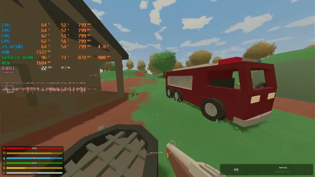 Game: Unturned Сomputer characteristics: Socket: BGA 1168 Motherboard: X751LD Processor: i5 4210U RAM: 12GB DDR3 1600 8GB+ 4GB GPU: NVIDIA GeForce 820M GPU2: Intel HD Graphics Family ROM: HDD 500GB OS + HDD 500GB GAMES Video in 1920x1080 resolution. Operating system: Windows 10 Pro