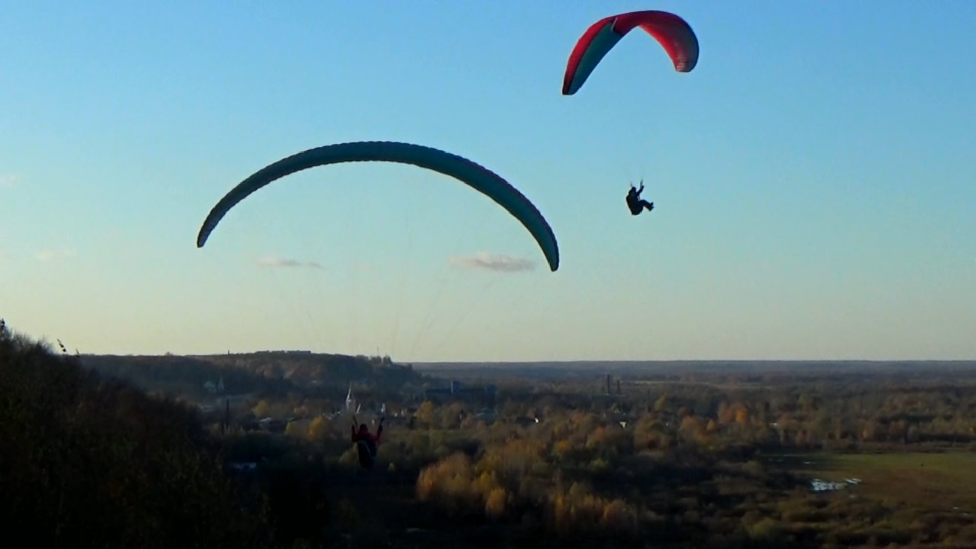 Парапланеристы в городе Вязники в солнечный осенний день. Съемка 21.10.2023