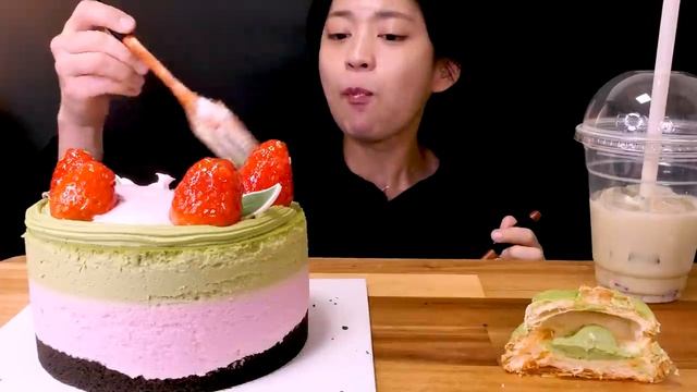 🍵뚜쥬 말차 특집__😍뚜레쥬르 딸기 말차 케이크와 말차 빵 먹방❤ _ Tous les Jours Strawberry Matcha Cake_ Bread ASMR Mukbang