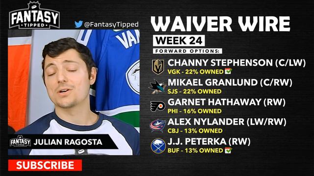 In this episode, we dive into the best players to add to your team for Week 24 of the Fantasy season and their fantasy relevance. If you want to take you support to the next level, link to my Patreon: https://www.patreon.com/FantasyTipped 0:00 - Intro 1:19 - Schedule 2:34 - Teams with Good & Bad Schedules 4:04 - Forwards Options 1 5:24 - Forwards Options 2 6:53 - Forwards Options 3 9:05 - Forwards Options 4 10:35 - Defense Options 1 11:53 - Defense Options 2 12:56 - Goalie Options 1 14:49 - Goalie Options 2 15:47 - Goalie Options 3 16:05 - My MANSAPED Must-Add Player #FantasyHockey #fantasyhockeyadvice ******************************************************************** Be sure to check out our sponsor! www.manscaped.com Promo Code: FANTASYTIPPED Get 20% off your order! ******************************************************************** Be Sure to Follow Me on Twitter for the latest Fantasy Hockey advice! https://twitter.com/FantasyTipped ********************************************************************
