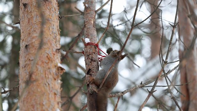Белка пытается развязать яркий шнурок, чтобы использовать его для строительства гнезда. В марте белки строят гнезда для выведения потомства, которое появится на свет уже в апреле. Видеоклип Валентина Колинько.