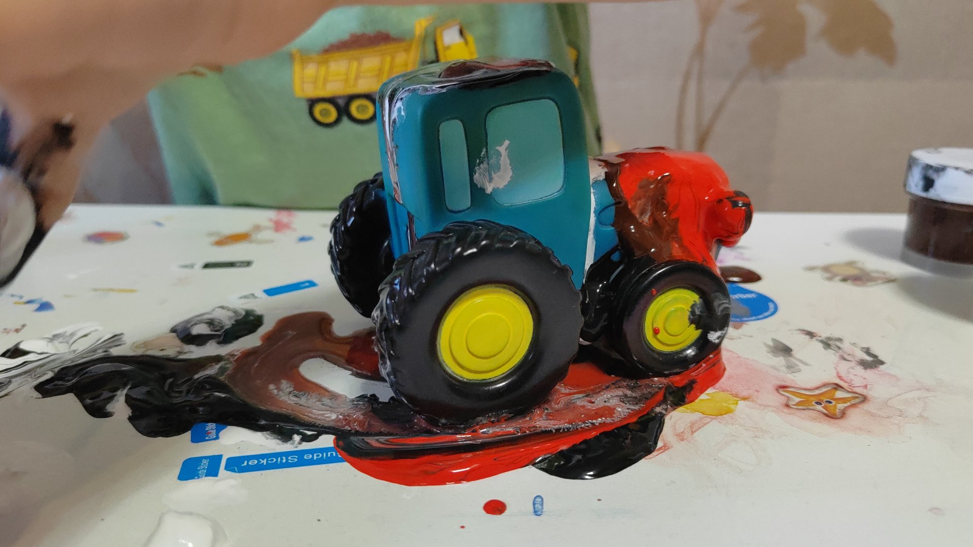 Синий трактор пачкаем в краске и моем его водой