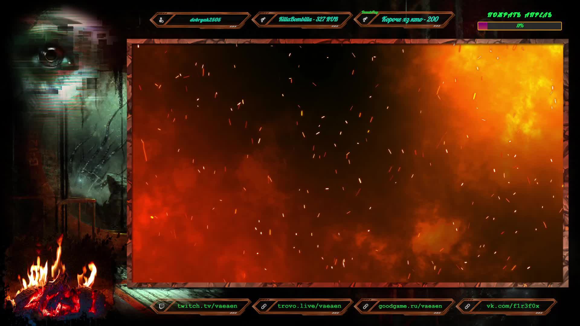 Если хотите поддержать меня как стримера - нажмите по данной ссылке https://www.donationalerts.com/r/f1r3f0x Donate for USD, EU all world - https://new.donatepay.ru/@vaeaen Во время стрима ваше сообщение появится на экране, и будет сопровождаться голосовым диктором. Поддержка на прямую: Сбер: 2202 2010 0629 1039 Тинькофф: 2200 7008 4677 0625 Основные каналы: Twitch: https://www.twitch.tv/vaeaen GoodGame: https://goodgame.ru/channel/Vaeaen/ Trovo: https://trovo.live/Vaeaen Дополнительные: Boosty: https://boosty.to/vaeaen VKplay: https://vkplay.live/vaeaen Wasd: https://nuum.ru/channel/vaeaen YouTube: https://www.youtube.com/channel/UCsl3CyRcImUYtWiCgEdvmjQ