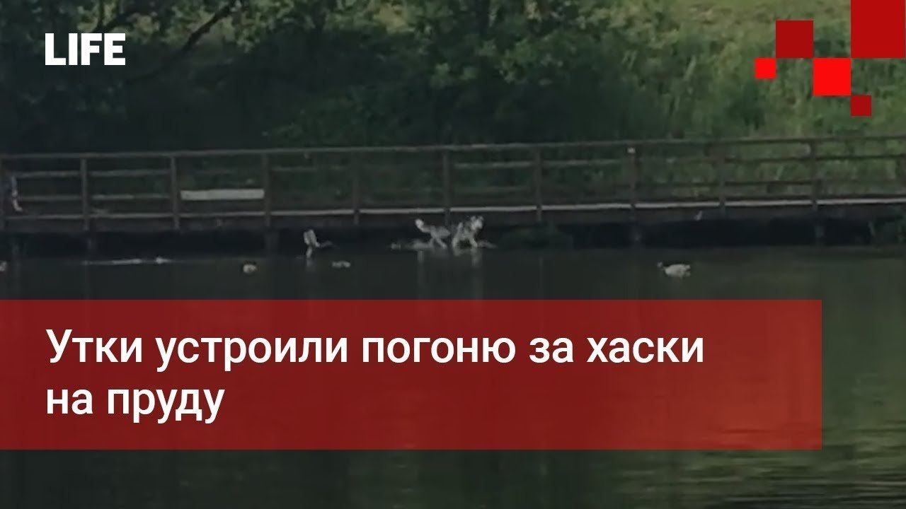 Утки устроили погоню за хаски на пруду