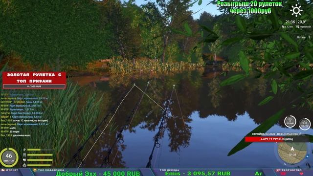 Поддержка донатом https://www.donationalerts.com/r/kalyamba11 Альтернативный донат https://new.donatepay.ru/@1032463 5536913964533059 карта Тинькоф Если стрим лагает,смотри стрим на трово https://trovo.live/s/Kalyamba_na_Ribalke Мой ВК - https://vk.com/kalyantv НИК в игре kalyan11 НАШ ДИСКОРД СЕРВЕР https://discord.gg/mSbnTJK8TB Заказ водоема на 1 час - 500р ( весь стрим 2500р ) Модерка на канале 1200р ( каждая следующая на 100р больше) Озвучка доната на 40р,50р,100р,200р,300р,500р,1000р ✅Призы в рулетке "ЗОЛОТАЯ" ✔ ЗОЛОТО ✔ ПРЕМ ✔ КАТУШКИ РАПТОР 40, АЗИМУТ 10000, СИЛЬВЕР 80, ТАЙГА с 30 ✔ ПАЛКИ ПИЛКЕРНАЯ, ДОНКА МОРСКИЕ, ✔ РОД ПОД, СТУЛЬЯ ✅Призы в рулетке СТАНДАРТ : ✔ катушка "РАПТОР 40" ✔ катушка "АЗИМУТ 10000" ✔ катушка "ТАЙГА С30, С40," ✔ катушки 60 для медного ( ЭВИИ, НАТОРЫ, ГОЛДА, и тд) ✔ ПИЛКЕРНОЕ УДИЛИЩЕ КОРОЛЕВА ОКЕАНА ✔ Морское Донное удилище ✔ прем ( 3, 7, 30 дней) ✔ золото ( 1, 3, 5, 10, 20 ,50) ✔ билет на море ( 1, 3, 5 дней) ✔ голд наживка и др. ✅Призы в рулетке "СТАРТОВАЯ" ✔ катушка "silver80" ✔ катушка "БЕЛЫЙ КАЛИБР" ✔ катушка "Черный калибр" ✔ катушка "Протон" ✔ катушка "Нарга 6000" ✔ Набор Фидерист и спинингист ✔ Карповик Фортуна ✔ фидерные удилища ✔ прем, золото, алкашка, наживки и тд P.s Рулетка это не казино, а награда за поддержку стримера. Вечный ТОП ПОДДЕРЖКИ (11.05.2024) 1. Dimon_pokemonchik 119 784 2. Interceptor 75 508 3. Skreb79 71 261 4. une personne 68 619 5. Нарвал77 31 550