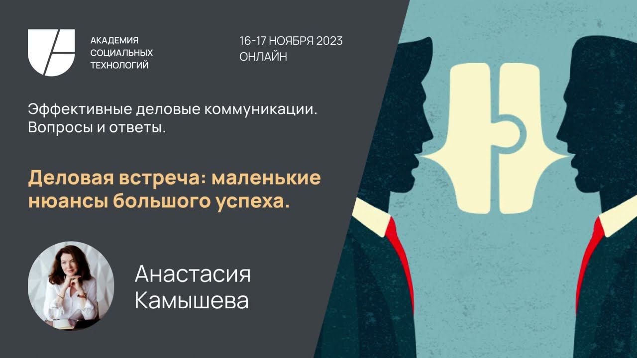 Конференция "Эффективные деловые коммуникации. Вопросы и ответы" 16 ноября 2023 г. Спикер Анастасия Камышева. Тема доклада "Деловая встреча: маленькие нюансы большого успеха". Как организовать встречу, как вести себя так, чтобы получить результат от общения. ➡️ Сайт конференции - https://etiquette.ast-academy.ru/ ➡️ Сайт Академии - https://ast-academy.ru/ ➡️ Стать экспертом Академии - https://ast-academy.ru/about_expert/ ➡️ Академия в ВКонтакте: https://vk.com/astacademy ➡️ Академия на Яндекс Дзен: https://dzen.ru/ast_academy ➡️ Открытый Telegram-канал Академии социальных технологий: https://t.me/AST_Academy