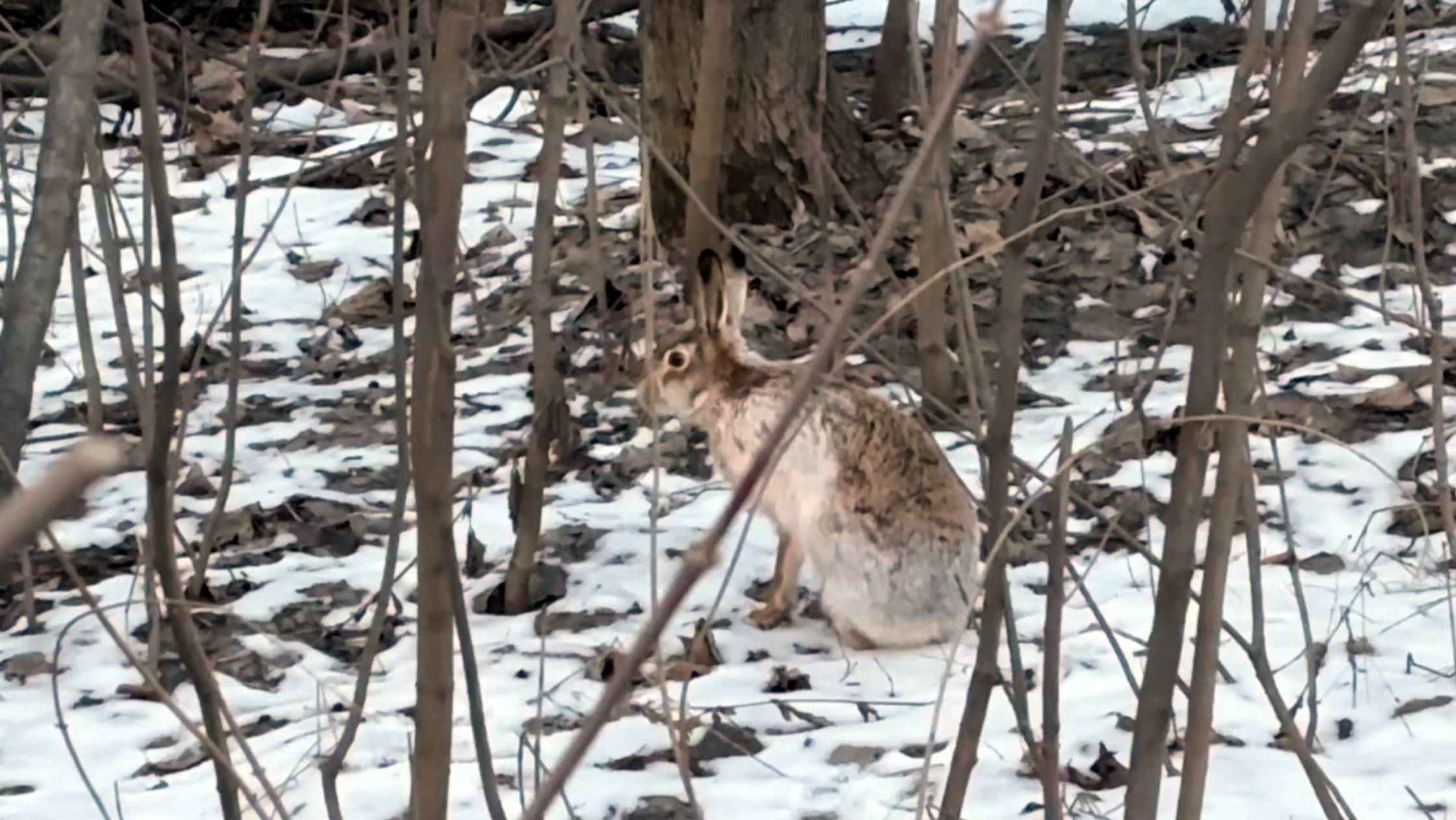 Последний день зимы, московский район Куркино. Рядом Куркинское шоссе. Заяц спокоен и особо людей не шугается! Видео Андрея Туманова.