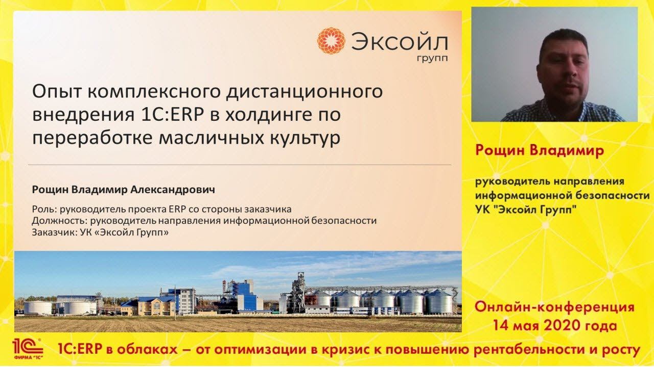 Опыт комплексного дистанционного внедрения 1C:ERP в холдинге по переработке масличных культур, Рощин Владимир, руководитель направления информационной безопасности, УК "Эксойл Групп". Онлайн-конференция "1С:ERP в облаках – от оптимизации в кризис к повышению рентабельности и росту", 14 мая 2020 года ГК "СофтБаланс" https://sb-vnedr.ru/ https://youtu.be/sxA4LHWygKg