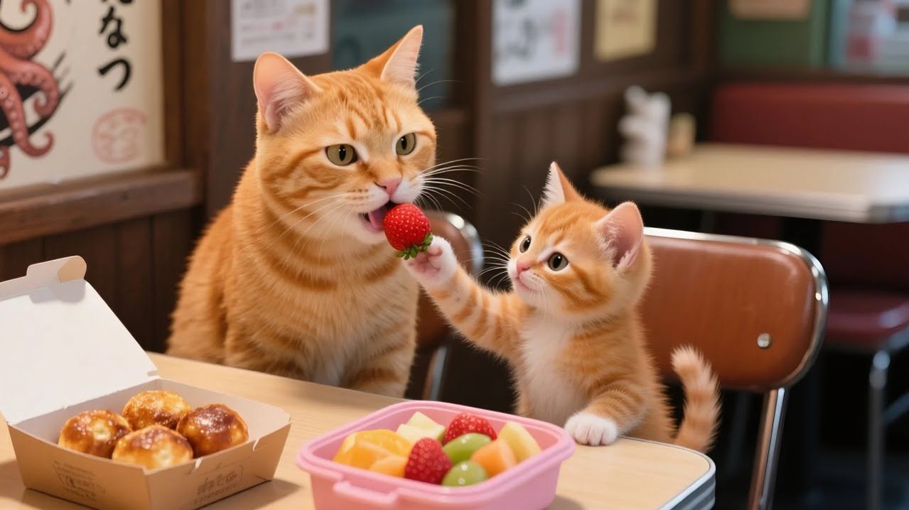 Мама-кошка работает в лавке с такояки, чтобы купить подарок для Рыжика на День детей! 🎁