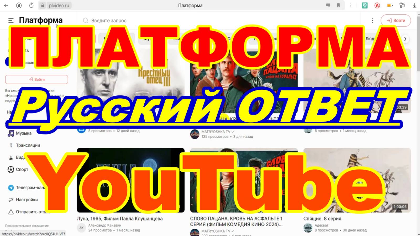 Видеохостинг ПЛАТФОРМА ! Русский ответ YouTube ссылка https://plvideo.ru/channel/CmDLqpfBEOeg