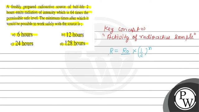 A freshly prepared radioactive source of half-life 2 hours emits radiation of intensity which is 64 times the permissible safe level. The minimum times after which it would be possible to work safely with the source is ; (A) 6 hours (B) 12 hours (C) 24 hours (D) 128 hours 📲PW App Link - https://bit.ly/YTAI_PWAP 🌐PW Website - https://www.pw.live