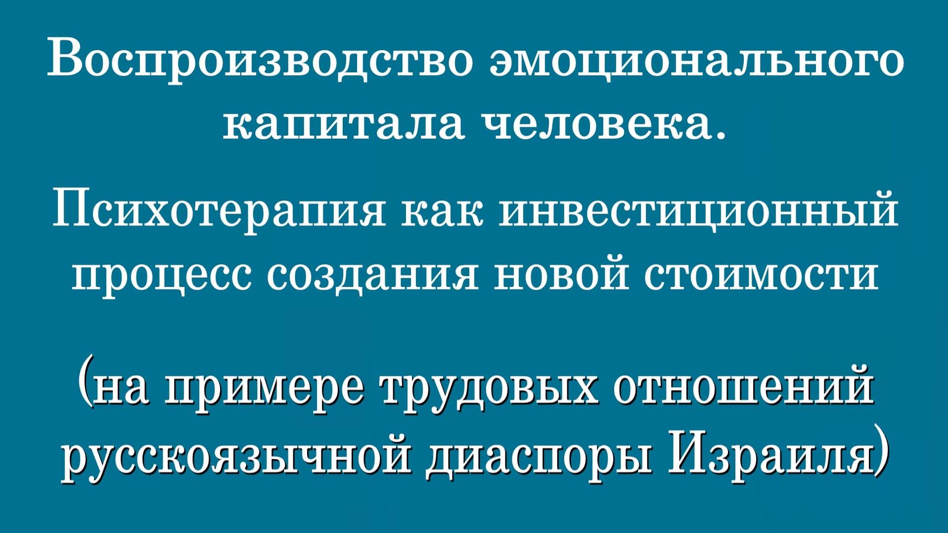 II ВСЕМИРНЫЙ КОНГРЕСС РУССКОЯЗЫЧНЫХ ПСИХОТЕРАПЕВТОВ И ПСИХОЛОГОВ (06.11.2023) Колпакова Ольга Николаевна Доктор экономических наук, PhD, главный учёный Психотерапевтического Исследовательского Центра, автор 53 научных работ, из них 7 монографий, посвященных эмоциям и эмоциональному капиталу, разработчик методики повышения эмоционального капитала при хронических заболеваниях (Израиль, Беэр-Шева) Выступление. «Воспроизводство эмоционального капитала человека. Психотерапия как инвестиционный процесс создания новой стоимости (на примере трудовых отношений русскоязычной диаспоры Израиля)» Звоните, задавайте вопросы: - Skype: hembra7 - E-mail: kaif.olga@yandex.com - https://www.youtube.com/@user-tb6ej6ol2b