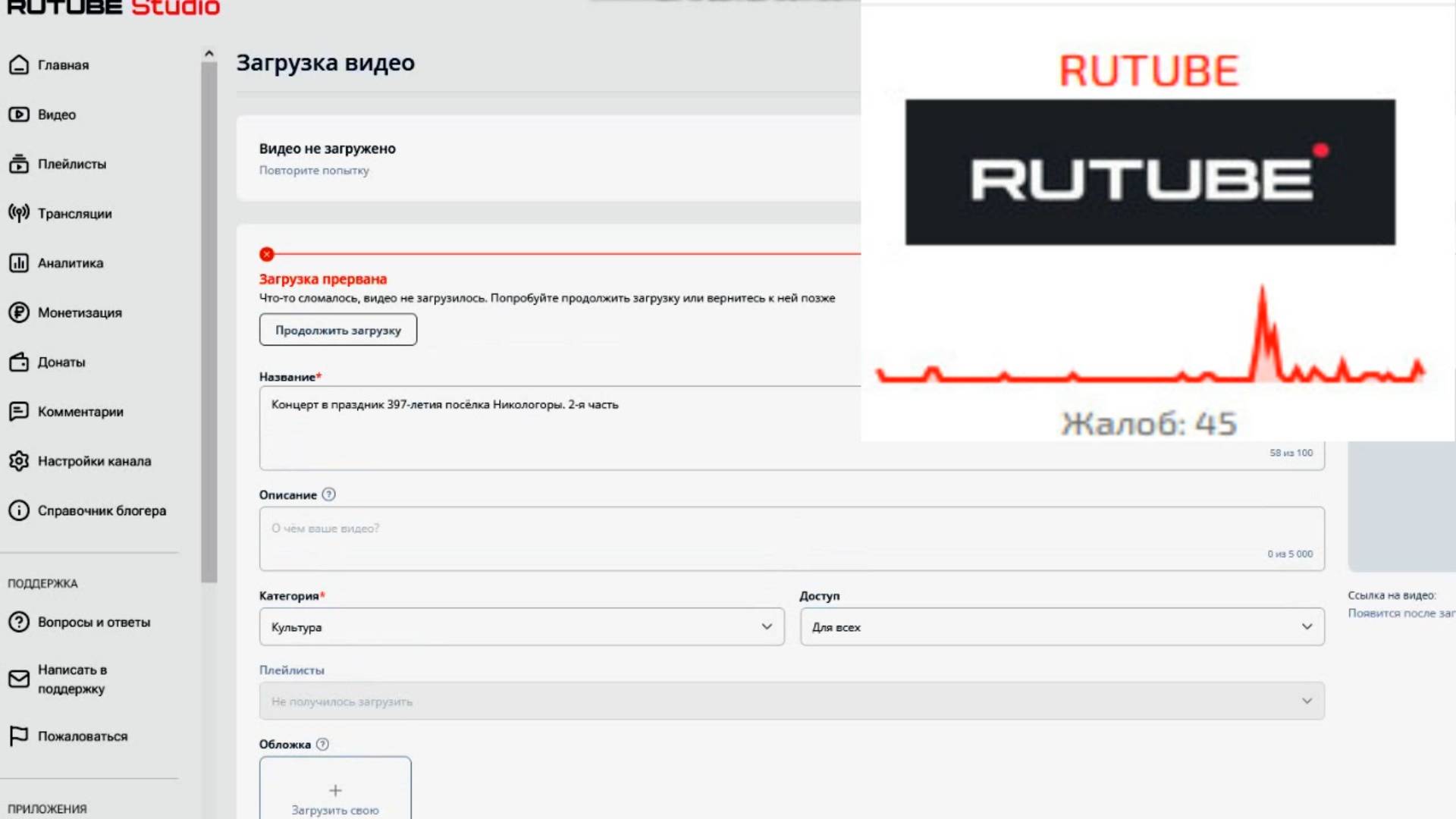 Сильный сбой в работе RUTUBE утром 22 августа 2025 года