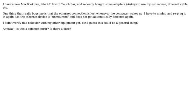 Apple: MBP Late 2016 Thunderbolt 3 issue: connected cables not recognized after sleep/wake up Helpful? Please support me on Patreon: https://www.patreon.com/roelvandepaar With thanks & praise to God, and with thanks to the many people who have made this project possible! | Content (except music & images) licensed under CC BY-SA https://meta.stackexchange.com/help/licensing | Music: https://www.bensound.com/licensing | Images: https://stocksnap.io/license & others | With thanks to user kimonostereo (apple.stackexchange.com/users/221406), user IconDaemon (apple.stackexchange.com/users/22824), user criedel (apple.stackexchange.com/users/219859), and the Stack Exchange Network (apple.stackexchange.com/questions/268715). Trademarks are property of their respective owners. Disclaimer: All information is provided "AS IS" without warranty of any kind. You are responsible for your own actions. Please contact me if anything is amiss at Roel D.OT VandePaar A.T gmail.com