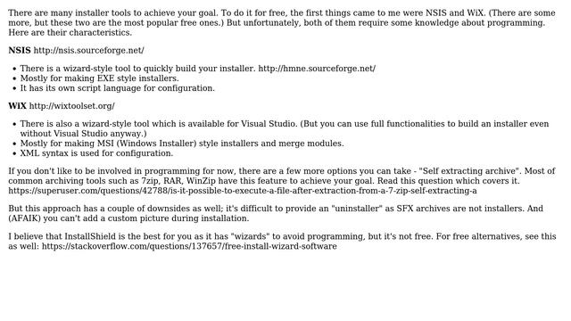 How can I create an installer? Helpful? Please support me on Patreon: https://www.patreon.com/roelvandepaar With thanks & praise to God, and with thanks to the many people who have made this project possible! | Content (except music & images) licensed under cc by-sa 3.0 | Music: https://www.bensound.com/royalty-free-music | Images: https://stocksnap.io/license & others | With thanks to user Scott Rhee (https://superuser.com/users/303230), user Keltari (https://superuser.com/users/94133), user farosch (https://superuser.com/users/440496), user CodeIt (https://superuser.com/users/383350), and the Stack Exchange Network (http://superuser.com/questions/907862). Trademarks are property of their respective owners. Disclaimer: All information is provided "AS IS" without warranty of any kind. You are responsible for your own actions. Please contact me if anything is amiss at Roel D.OT VandePaar A.T gmail.com.