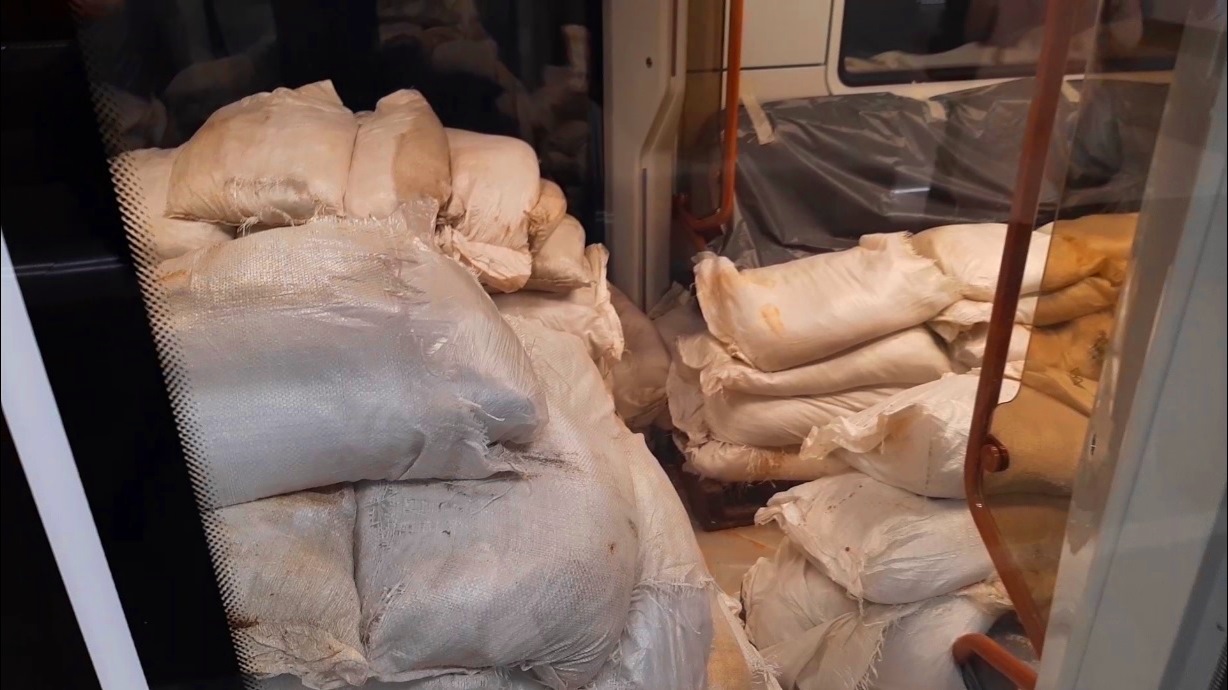 Состав с мешками песка...на станции "Мичуринский проспект"