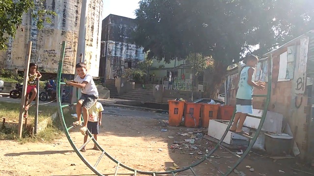 Смелые дети из Бразилии используют в качестве качелей оторванную полукруглую лестницу, которую обычно ставят на детских площадках.