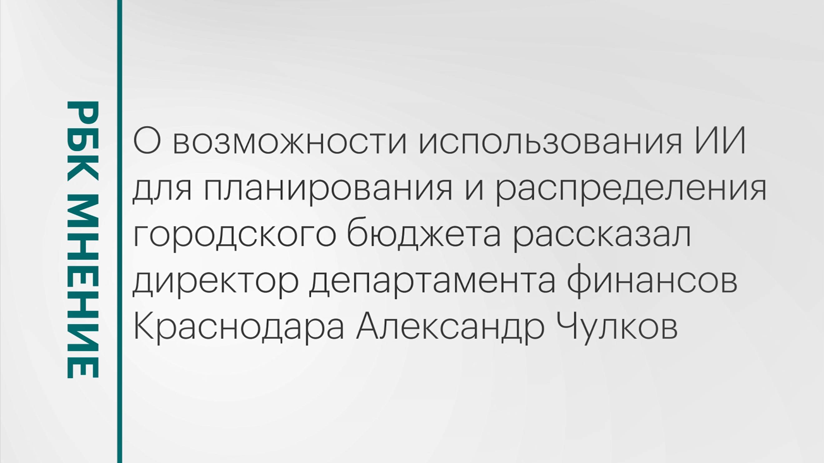 О возможности использования ИИ для планирования и распределения городского бюджета в интервью РБК ТВ Юг рассказал директор департамента финансов Краснодара Александр Чулков. Подписывайтесь на нас в социальных сетях: ВКонтакте: https://vk.com/rbcyug Telegram: https://t.me/rbc_krasnodar, https://t.me/rbcrostov, https://t.me/rbc_kavkaz Подпишитесь на канал РБК Юг, чтобы смотреть новые выпуски первыми!