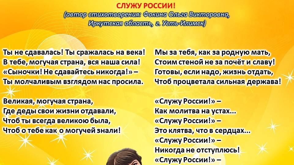 Читает автор стихотворения: ФОКИНА ОЛЬГА ВИКТОРОВНА (Иркутская область, город Усть-Илимск) СТИХИ: https://stihi.ru/2018/07/08/3790 БИОГРАФИЯ: http://www.proza.ru/2019/10/08/1473 ВЫИГРЫВАЙТЕ КНИГИ БЕСПЛАТНО: https://proza.ru/2017/09/17/447 ОТЗЫВЫ ЧИТАТЕЛЕЙ: http://www.proza.ru/2019/11/29/611 Из книги Фокиной Ольги Викторовны (Усть-Илимск) «Несу добро в ладошках!»: [все стихотворения с 2005 по октябрь 2020 гг., проза, авторские песни, интервью]. – Москва: МГО Союза писателей России, 2020 г. – 886 стр., ил. ISBN 978-5-7949-0826-8 СЛУЖУ РОССИИ! (автор стихотворения: Фокина Ольга Викторовна, Иркутская область, г. Усть-Илимск) Ты не сдавалась! Ты сражалась на века! В тебе, могучая страна, вся наша сила! «Сыночки! Не сдавайтесь никогда!» – Ты молчаливым взглядом нас просила. Великая, могучая страна, Где деды свои жизни отдавали, Чтоб ты всегда великою была, Чтоб о тебе как о могучей знали! Мы за тебя, как за родную мать, Стоим стеной не за почёт и славу! Готовы, если надо, жизнь отдать, Чтоб процветала сильная держава! «Служу России!» – Как молитва на устах... «Служу России!» – Это клятва, что в сердцах... «Служу России!» – Никогда не отступлюсь! «Служу России!» – Своей Родиной горжусь! 6 февраля 2014 г. Стихотворение зарегистрировано на авторские права, поэтому его цитирование возможно только с указанием полного авторства: Фокина Ольга Викторовна (г. Усть-Илимск)