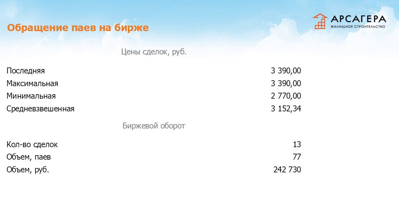 Управляющий трейдер УК «Арсагера» Вячеслав Питенко об операциях с активами, активах, составе фонда недвижимости за август 2017 Стоимость пая, изменение индекса По итогам месяца стоимость пая понизилась на 0,3 %. На изменение стоимости пая повлияли: начисленные проценты по депозитам и инфраструктурные расходы фонда. Индекс вторичного рынка Санкт-Петербурга по данным издания «Бюллетень недвижимости» за этот же период снизился на 1,03 %. Обращение паев на бирже Средневзвешенная цена сделок с паями фонда «Арсагера – жилищное строительство» на бирже в августе составила 3 152 рубля. Объем торгов за отчетный период Вы можете видеть на своих экранах. Информация об активах фонда На отчетную дату в состав активов фонда входят 11 квартир с правом собственности, 34 квартиры на стадии строительства, а также денежные средства и дебиторская задолженность. Информация о депозитах Информация о банках, в которых размещены денежные средства на депозитах, представлена на Ваших экранах. Процентные ставки находятся в диапазоне от 7,7% до 10,75%. Информация по квартирам в продаже На отчетную дату в продаже находятся 10 квартир. Пересмотр цен реализации на квартиры в продаже происходит 1 раз в 2 недели. Цены устанавливаются в зависимости от статистики звонков и просмотров квартир, а также ситуации на вторичном рынке недвижимости. Средняя цена по реализационной стоимости составила 87 053 рубля. Операции с активами В августе сделок по приобретению и продаже квартир фонда не совершалось. На этом у меня все. Спасибо за внимание, до свидания.